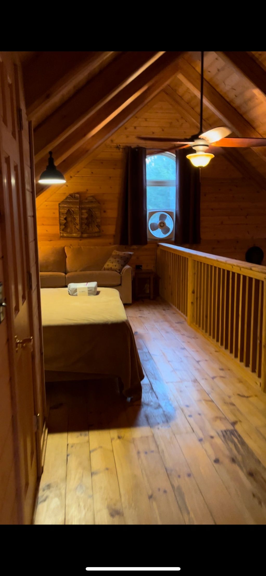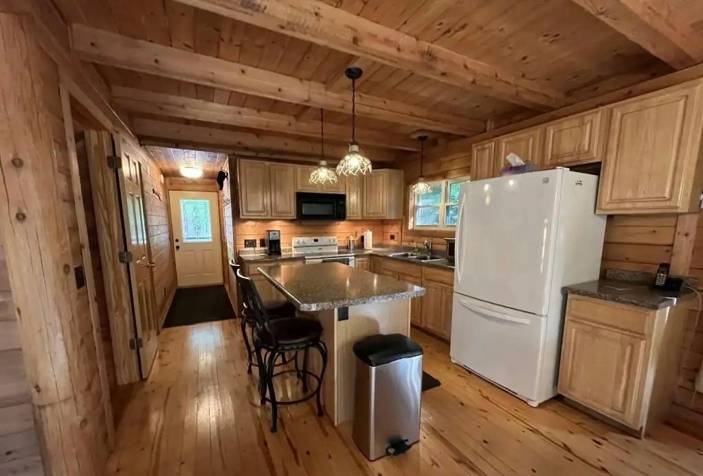 The cabin features a well-equipped kitchen with a central island, refrigerator, microwave, and stove, making it easy to prepare meals and entertain. Both a Keurig and a traditional coffee maker are provided, so you can enjoy your favorite brew each morning. Lare windows and a sliding glass door offer beautiful views of the surrounding Hiawatha National Forest and wildlife-bringing the serenity of