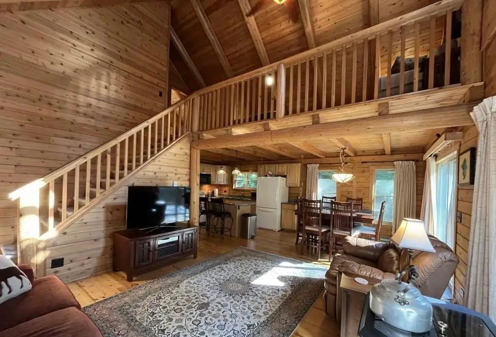 Step into a warm and inviting living room where rustic wood beams and natural textures create an unmistakable sense of coziness. Sunlight pours through windows, illuminating a spacious loft above perfect for relaxing or taking in the charming cabin view.